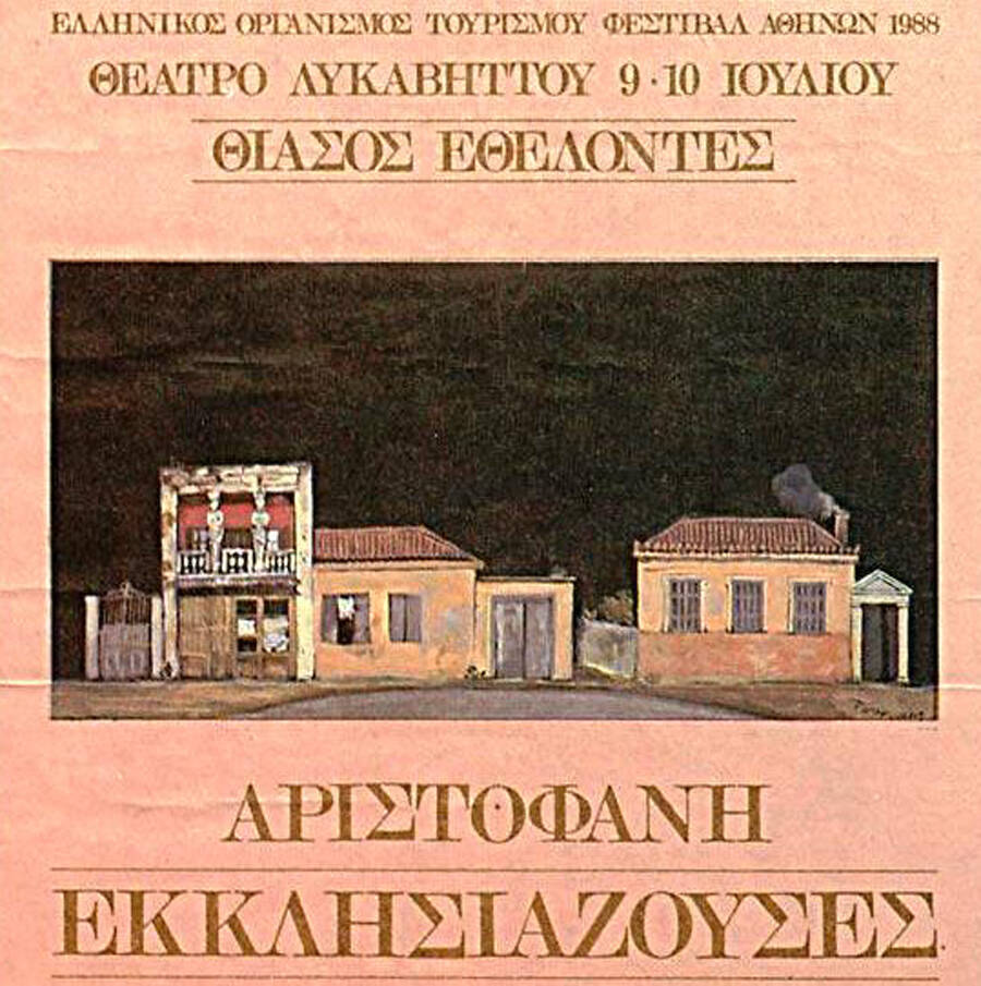 Το εξώφυλλο της αφίσας για τις «Εκκλησιάζουσες» του Αριστοφάνη, φιλοτεχνημένη από τον Γιάννη Τσαρούχη το 1988