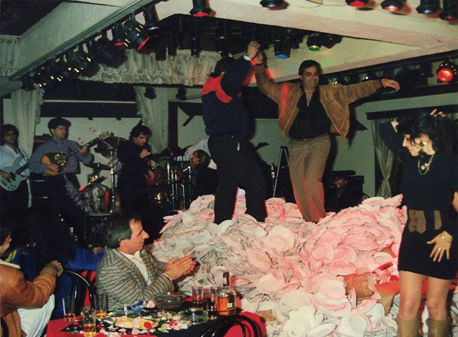 Είναι από την εποχή που η Ελλάδα αναστέναζε στις πίστες των νυχτερινών κέντρων. Μια εποχή που κυριαρχούσε η δίψα για αυτοπροβολή και κατασπατάληση (όσων τα… είχαν) χρημάτων. Τότε που αυτός που τα είχε φρόντιζε να ανοίξει περισσότερες σαμπάνιες και κυρίως να σπάσει περισσότερα πιάτα από τον κύριο με τη λευκή κάλτσα, το σκαρπίνι και το λαμέ σακάκι στο απέναντι τραπέζι.