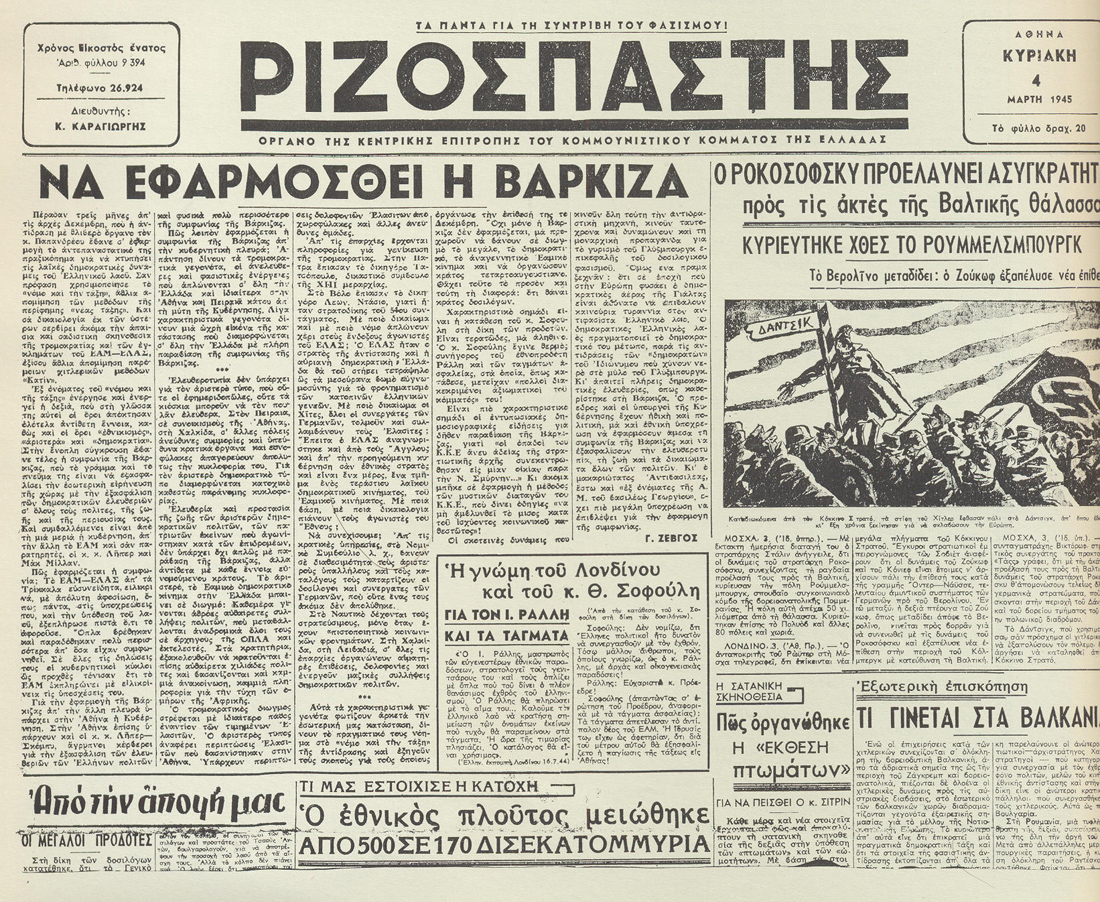 Δύο χιλιόμετρα μακριά από την παραλία της Βάρκιζας, σε μια πολυτελή βίλα, θα εκτυλιχθεί το βράδυ της 12ης Φεβρουαρίου 1945 το σκηνικό της Συμφωνίας ανάμεσα στις βρετανικές και κυβερνητικές δυνάμεις από τη μια πλευρά και τις δυνάμεις του Εθνικού Απελευθερωτικού Μετώπου που έλεγχε το ΚΚΕ από την άλλη, μετά την ανακωχή των Δεκεμβριανών. Ένας συμβιβασμός που εξακολουθεί να προκαλεί αντιδράσεις. Ήταν όντως επώδυνος όπως πιστεύει η Αριστερά μέχρι και σήμερα ή τίμιος όπως υποστήριζαν οι κυβερνητικές δυνάμεις τότε;