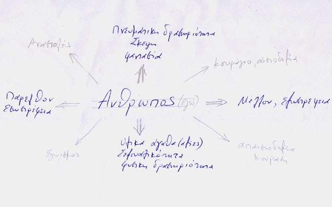 Τέλος φαίνονται ξεκάθαρα και οι σχέσεις του «εγώ» με το υπερεγώ και το ένστικτο. Να θυμίσουμε πως το υπερεγώ είναι το πρέπει μου, αυτό που μου επιβάλλεται από την κοινωνία, την οικογένεια και άλλους εξωγενείς παράγοντες ενώ το ένστικτο είναι ουσιαστικά το θέλω. Από την γραφή σκιαγραφείται ξεκάθαρα η ισορροπία αυτής της σχέσης όπου το εγώ είναι στη μέση και κονταροχτυπιέται με το ένστικτο την ώρα που το υπερεγώ επιβάλλει.