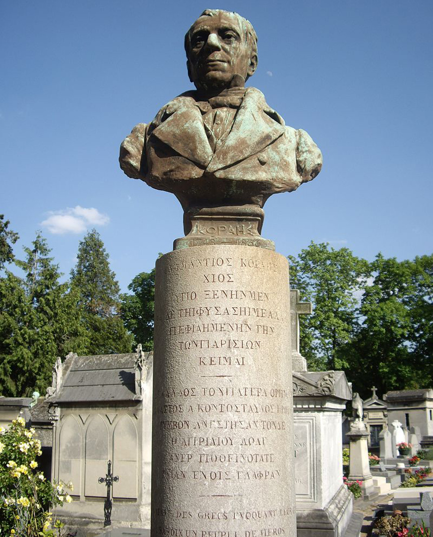 Η δε επιτύμβια στήλη του Χιώτη διαφωτιστή γράφει: «Ἀδαμάντιος Κοραῆς Χίος Ὑπὸ ξένην μὲν ἴσα δὲ τῇ φυσάσῃ μ’ Ἑλλάδι πεφιλημένην γῆν τῶν Παρισίων κεῖμαι». Να σημειωεί ότι το μνήμα στη Γαλλία είναι κενό, καθώς χρόνια μετά τον θάνατό του το 1833, τα οστά μεταφέρθηκαν στο Α’ Νεκροταφείο Αθηνών, όπου φυλάσσονται μέχρι και σήμερα.
