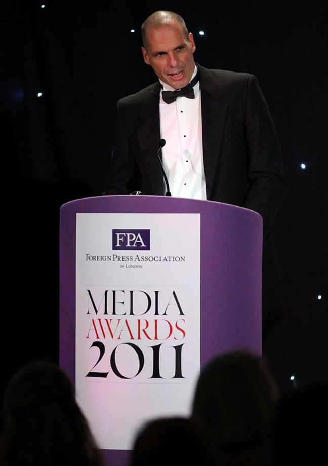 Ο Γιάννης Βαρουφάκης σε ένα σπάνιο στιγμιότυπο. Με παπιγιόν και κοστούμι. Η φωτογραφία ανέβηκε στο Facebook της Ένωσης Ξένων Ανταποκριτών του Λονδίνου