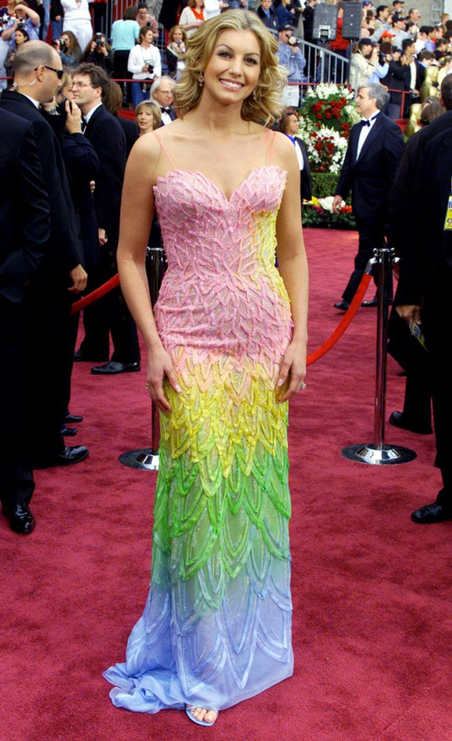 Και αίφνης βγήκε το ουράνιο τόξο στα Όσκαρ. Τι άλλο σας θυμίζει το φόρεμα της τραγουδίστριας Faith Hill (Versace παρακαλώ!) όταν το κοιτάτε; Ροζ, κίτρινο, πράσινο, γαλάζιο, όλη η παλέτα των χρωμάτων είχε επιλεγεί γι’ αυτό το ύφασμα. Όταν βέβαια την ακούσαμε να τραγουδάει «Somewhere Over the Rainbow» καταλάβαμε την ατυχή επιλογή εμφάνισης, που την κατέταξε (ας είμαστε δίκαιοι!) στις κυρίες που δεν είχαν την καλύτερη έμπνευση της στιγμής της επιλογής!