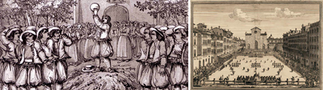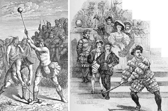 Όποιος πιστεύει ότι το ποδόσφαιρο ή ακόμα καλύτερα το ράγκμπι είναι βίαια σπορ, ώρα να ρίξει μια ματιά στο μεσαιωνικό αντίστοιχό τους. Καταρχάς, ούτε κανόνες υπήρχαν για τον αριθμό των παικτών κάθε ομάδας ούτε φάουλ και άλλες τέτοιες τυπικότητες: βίαια μαρκαρίσματα, τρικλοποδιές και ό,τι άλλο μπορούσες να σκεφτείς ήταν απολύτως δεκτά. Ο σκοπός πάναπλος: δύο ομάδες που προσπαθούσαν να περάσουν την μπάλα -ο θεός να την κάνει (μια παραγεμισμένη ουροδόχος κύστη ζώου!)- από τη γραμμή ώστε να σκοράρουν. Είπαμε όμως, πρακτικά κανόνες δεν υπήρχαν και συχνά τα πράγματα ξέφευγαν, όταν έμπαιναν μάλιστα και τοπικιστικοί παράγοντες εντός τους: τα ματς μεταξύ γειτονικών χωριών, ας πούμε, κρατούσαν για μέρες και δεν ήταν σπάνιο κάποιος να φεύγει μαχαιρωμένος από τον αγωνιστικό χώρο, καθώς τα μαχαίρια φυσικά και δεν απαγορεύονταν! Ορόσημο στέκει εδώ ο ουαλός ποιητής του 16ου αιώνα William Midleton, ο οποίος περιγράφει γλαφυρά τα πάμπολλα τραύματα που έφεραν οι παίκτες του gameball, ενός παιχνιδιού τόσο τρομακτικού στην εκτέλεσή του που ο βασιλιάς Εδουάρδος Δ’ και άλλοι ευρωπαίοι μονάρχες αναγκάστηκαν τελικά να το απαγορεύσουν. Και θα έπαιρνε ακριβώς αιώνες για να εξελιχθεί το υπερβίαιο gameball στο σχεδόν πολιτισμένο ποδόσφαιρο και αμερικανικό ποδόσφαιρο του σήμερα…