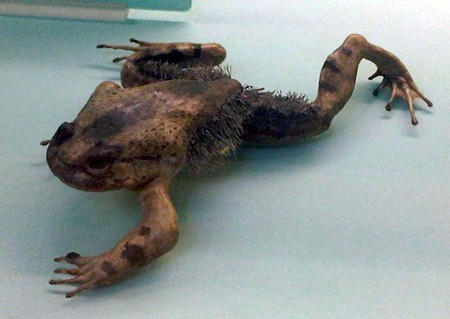 Την ώρα που αυτό είναι από μόνο του ασυνήθιστο, ο εν λόγω βάτραχος διαθέτει και μια αποκρουστική αμυντική προσαρμογή που δεν συναντάται πουθενά αλλού στο ζωικό βασίλειο: όταν τον αιχμαλωτίσει ο θηρευτής, ο Τριχωτός Βάτραχος σπάει κυριολεκτικά τα κόκαλά του μόνος του και τα πιέζει κάθετα για να βγουν από το δέρμα του, ώστε οι εκτεθειμένες αυτές ακίδες να μπορούν να χρησιμοποιηθούν ως μικροσκοπικά νύχια, δίνοντάς του έτσι ένα όπλο προστασίας. Μετά τη μάχη και αν επιβιώσει, τα «νύχια» αποσύρονται μέσα στο σώμα και οι πληγές επουλώνονται αξιοσημείωτα γρήγορα. Ένα είδος ζωικού Wolverine δηλαδή!