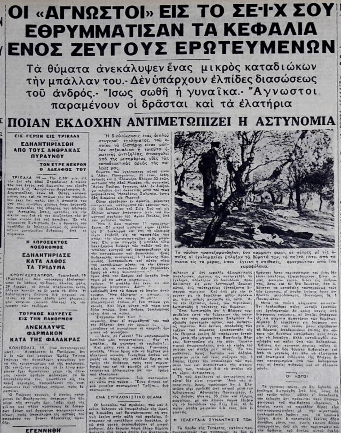 Η παγωνιά που επικρατούσε μέσα στη νύχτα, είχε σταματήσει την αιμορραγία τους. Θύματα ήταν ο 33χρονος λεβητοποιός Αθανάσιος Παναγιώτου και η συνομήλική του Ελεωνόρα Βλάχου. Ο δράστης τους είχε ληστέψει ενώ η κοπέλα αν και είχαν σκιστεί τα ρούχα της, δεν έφερε ίχνη ασελγούς πράξεως.