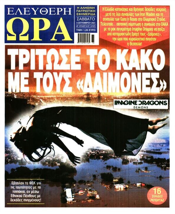 Τελευταία… σατανική σύμπτωση η συναυλία στο ΟΑΚΑ με το ροκ συγκρότημα Imagine Dragons να παίζει υπό καταρρακτώδη βροχή τους «Δαίμονες», την ώρα που κυριολεκτικά πνιγόταν η Θεσσαλία!», αναφέρει η εφημερίδα σε άλλο σημείο του πρωτοσέλιδου.