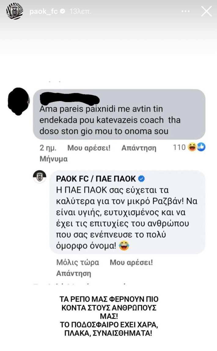 «Η ΠΑΕ ΠΑΟΚ σας εύχεται τα καλύτερα για τον μικρό Ράζβαν. Να είναι υγιής, ευτυχισμένος και να έχει τις επιτυχίες του ανθρώπου που σας ενέπνευσε το πολύ όμορφο όνομα!», έγραψε στην ανάρτησή της και στο Instagram συνόδεψε το screenshot με την λεζάντα πως το ποδόσφαιρο έχει πλάκα, χαρά και συναισθήματα. Κι ενίοτε πολύ χιούμορ.
