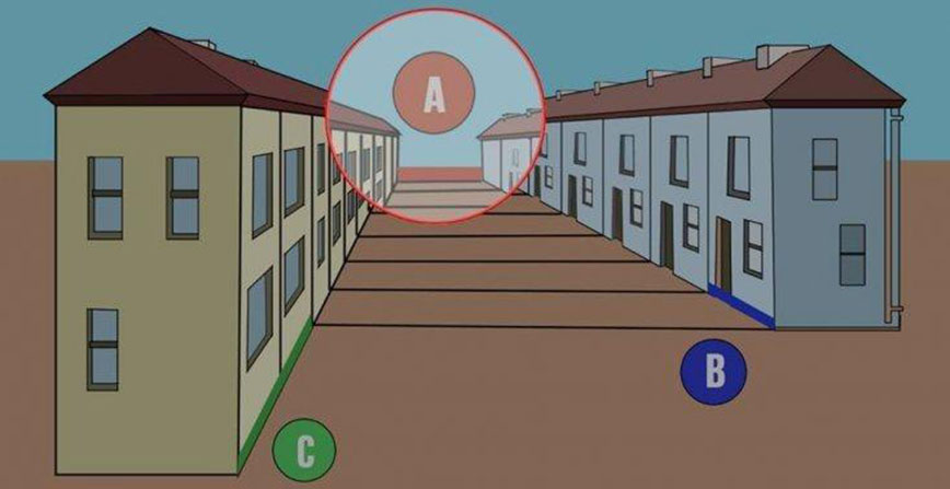Μπορεί να νομίζεις αρχικά ότι η μακρύτερη γραμμή είναι η ευθεία C, αλλά στην πραγματικότητα η μακρύτερη γραμμή είναι η Α. Αντίθετα η πιο κοντή γραμμή είναι η Β. Γιατί συμβαίνει αυτό; Το ότι η A έχει τα περισσότερα μέτρα φαίνεται ήδη στο προσκήνιο καθώς πρόκειται για μια γραμμή που συνδέει δύο ομάδες κτιρίων και είναι τόσο μακριά τόσο στην αρχή όσο και στο τέλος του δρόμου. Το ότι φαίνεται σαν η μικρότερη είναι απλώς μια ψευδαίσθηση.