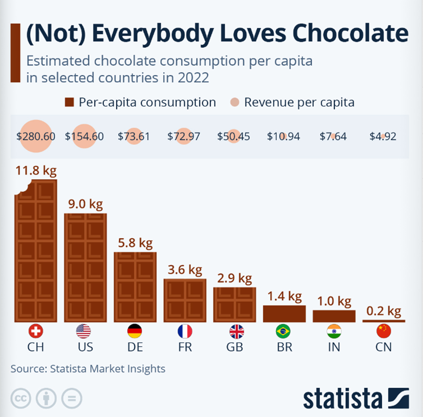Η Ελβετία βρίσκεται στην πρώτη θέση της λίστας που δημοσίευσε το Statista.com σχετικά με τη μέση ποσότητα κατανάλωσης σοκολάτας κατά άτομο για το 2022. Εξάλλου, αν σκεφτεί κανείς ότι είναι στην κορυφή και στην παραγωγή σοκολάτας, αυτό έχει μια εξήγηση.