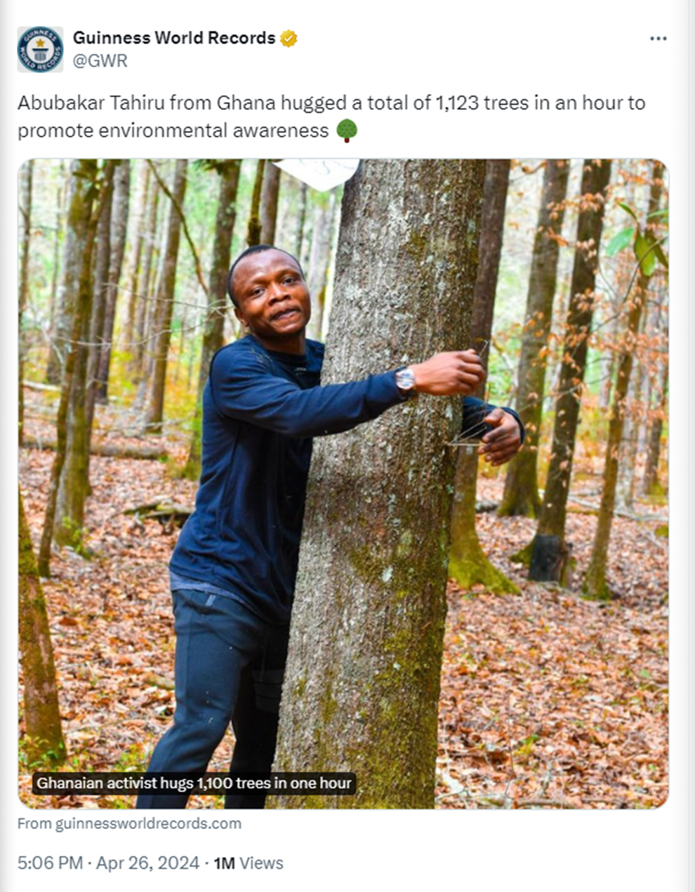 Ένας άντρας από την Γκάνα, που σπουδάζει δασοπονία στην Αλαμπάμα, σημείωσε παγκόσμιο ρεκόρ για τα περισσότερα δέντρα που έχει αγκαλιάσει άνθρωπος μέσα σε μια ώρα. Το ρεκόρ το πέτυχε αγκαλιάζοντας 1.123 δέντρα στον Εθνικό Δρυμό Tuskegee.