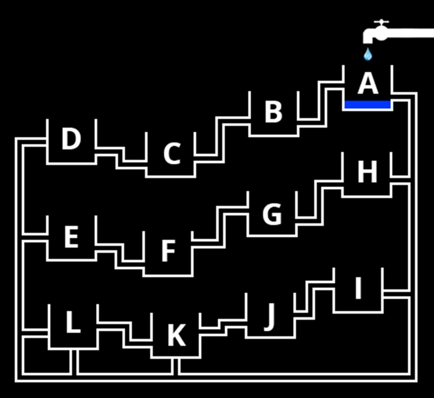 Πρώτη θα γεμίσει η δεξαμενή F. Ο λόγος είναι ότι τα δοχεία L, K, J και I είναι μπλοκαρισμένα άρα το νερό δεν περνά από εκεί!