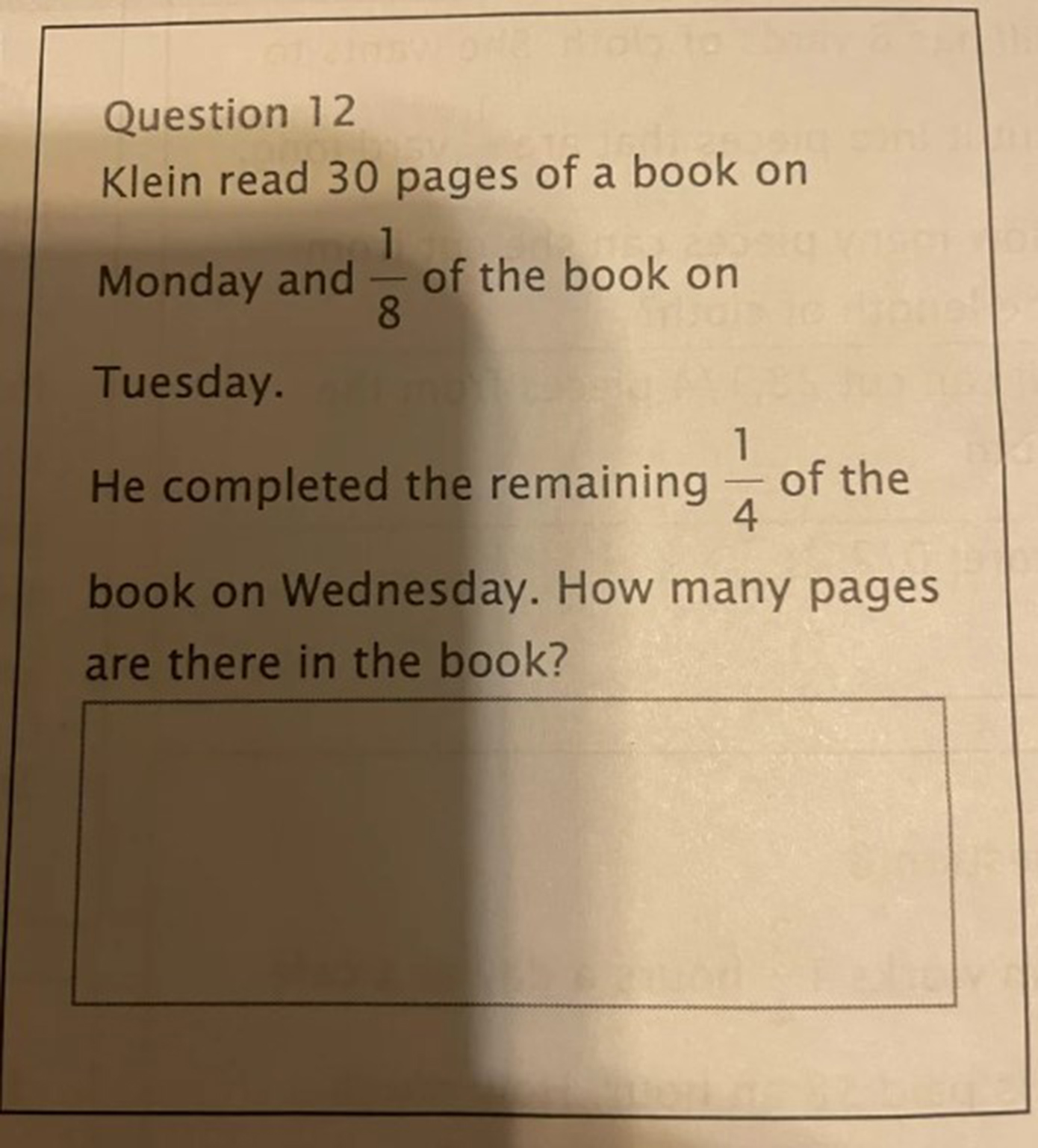«Ο Κλάιν διάβασε 30 σελίδες ενός βιβλίου τη Δευτέρα και το 1/8 του βιβλίου την Τρίτη. Ολοκλήρωσε το υπόλοιπο 1/4 του βιβλίου την Τετάρτη. Πόσες σελίδες έχει το βιβλίο;».