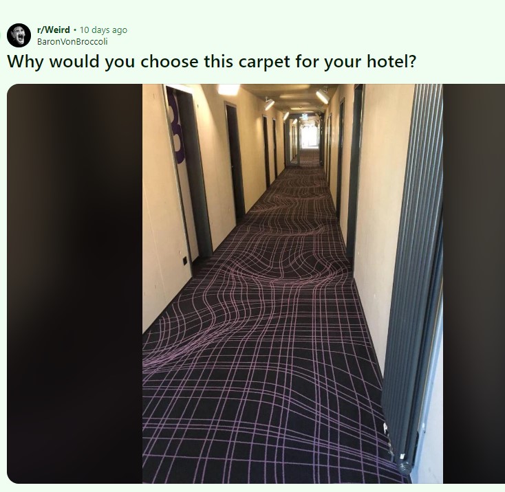 Το συγκεκριμένο ξενοδοχείο, στο οποίο έμεινε ο τουρίστας έχει ένα χαλί – όπως θα δείτε και στη φωτογραφία που μάλλον προκαλεί μια μικρή ζάλη όταν το βλέπεις λόγω του σχεδίου που έχει επάνω του. Για ποιο λόγο, όμως, είναι έτσι; Το συγκεκριμένο χαλί αποτρέπει, στην πραγματικότητα, τους ανθρώπους από το να τρέχουν πάνω-κάτω στους διαδρόμους. Αυτές οι γραμμές πάνω του δίνουν στους επισκέπτες μια αίσθηση αποπροσανατολισμού – κάνοντας το δάπεδο να μοιάζει σαν να μην είναι μια επίπεδη επιφάνεια.