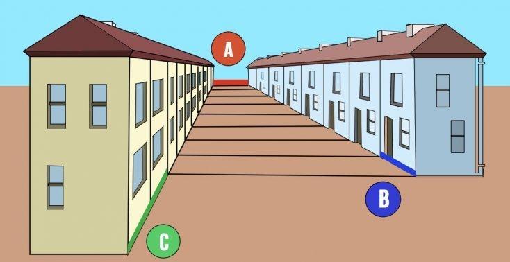 Μπορεί να νομίζεις αρχικά ότι η μακρύτερη γραμμή είναι η ευθεία C, αλλά στην πραγματικότητα η μακρύτερη γραμμή είναι η Α. Αντίθετα η πιο κοντή γραμμή είναι η Β. Γιατί συμβαίνει αυτό; Το ότι η A έχει τα περισσότερα μέτρα φαίνεται ήδη στο προσκήνιο καθώς πρόκειται για μια γραμμή που συνδέει δύο ομάδες κτιρίων και είναι τόσο μακριά τόσο στην αρχή όσο και στο τέλος του δρόμου. Το ότι φαίνεται σαν η μικρότερη είναι απλώς μια ψευδαίσθηση.