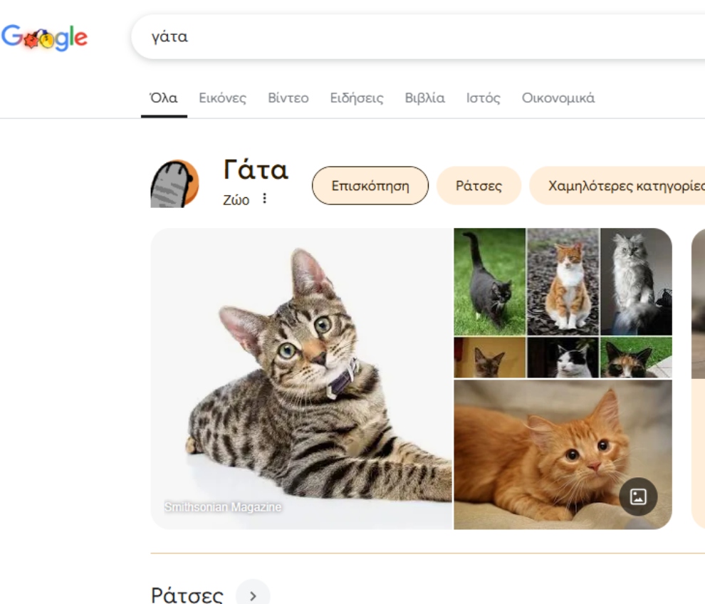 Κάτι παρόμοιο με τους σκύλους συμβαίνει και αν πληκτρολογήσεις «γάτα» στο Google. Αρχικά, όπως είναι και το αναμενόμενο θα σου εμφανίσει πληροφορίες για γάτες.