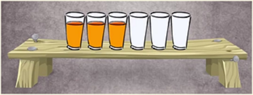 Ο γρίφος έχει ως εξής: Έχουμε συνολικά έξι ποτήρια στη σειρά πάνω σε ένα τραπέζι. Τα τρία πρώτα ποτήρια είναι γεμάτα με χυμό πορτοκαλιού ενώ τα επόμενα τρία ποτήρια είναι άδεια. Αν κάνουμε μόνο μία κίνηση, πώς μπορούμε να κάνουμε τα ποτήρια να βρίσκονται στη σειρά εναλλάξ γεμάτα και άδεια; Η απάντηση παρακάτω…