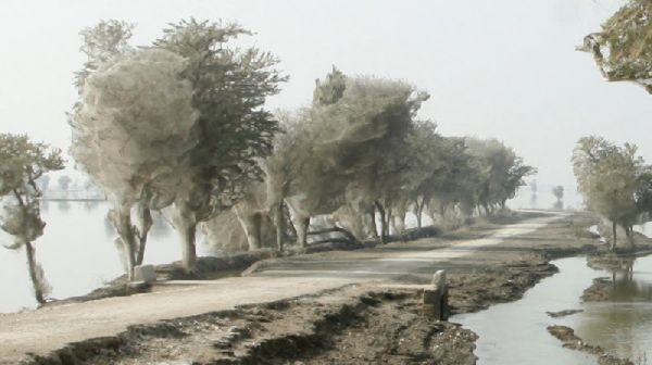 Τα δέντρα στις ακόλουθες φωτογραφίες είναι πλήρως καλυμμένα από αράχνες και ιστούς. Το σκηνικό αυτό εκτυλίχθηκε σε περιοχή του Πακιστάν. Η άνοδος των υδάτων έκανε εκατοντάδες χιλιάδες αράχνες να αναζητήσουν καταφύγιο πάνω στα δέντρα!