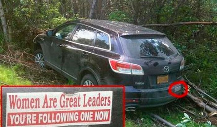 Και για όσους δεν κατάλαβαν, μεταφράζουμε τι λέει το ταμπελάκι στον προφυλακτήρα του αυτοκινήτου: Οι γυναίκες είναι μεγάλοι ηγέτες. Ακολουθείτε μία τώρα.