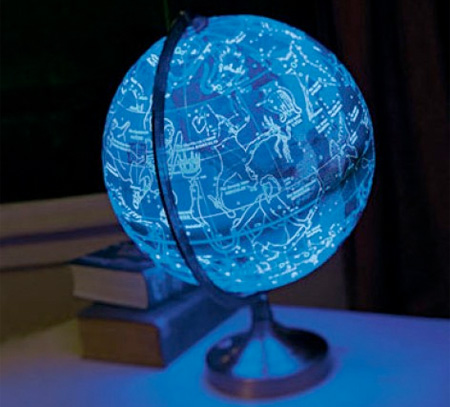 Υδρόγειος σφαίρα, με ενσωματωμένο μοτοράκι για να περιστρέφεται και με τους αστερισμούς σχεδιασμένους πάνω της