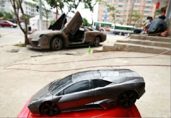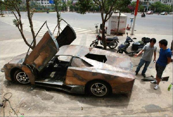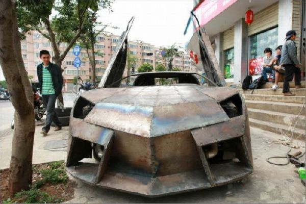 Ένας κουρέας στη Κίνα με το που είδε τη Lamborghini Reventon, την ερωτεύτηκε αμέσως. Η τιμή της όμως, που είναι στα 1,6 εκατομμύρια ευρώ θεωρείται απαγορευτική από πολλούς, αλλά και από τον φίλο μας τον κινέζο. Οπότε αυτό που έκανε ήταν να αγοράσει μια μινιατούρα του αυτοκινήτου, για να τη χρησιμοποιήσει ως οδηγό για το σχέδιο, και τρεις οξυγονοκολλητές. Μετά από μερικές μέρες το παλιό του Nissan μετατράπηκε στο αυτοκίνητο των ονείρων του. Θέλει ένα βαψιματάκι όμως…
