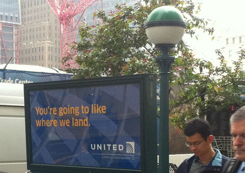 Η αεροπορική εταιρεία American United, προσπάθησε να προωθήθεί με το συγκεκριμένο σλόγκαν «Θα σας αρέσει το που, προσγειωνόμαστε». Έτσι σε μία στάση μετρό, δίπλα στους Δίδυμους Πύργους, τοποθέτησαν τη συγκεκριμένη διαφήμιση. Βέβαια υπαίτια είναι η διαφημιστική που δεν μερίμνησε να ελέγξει πρώτα τα σημεία, που θα τοποθετηθούν οι εν λόγω διαφημίσεις.