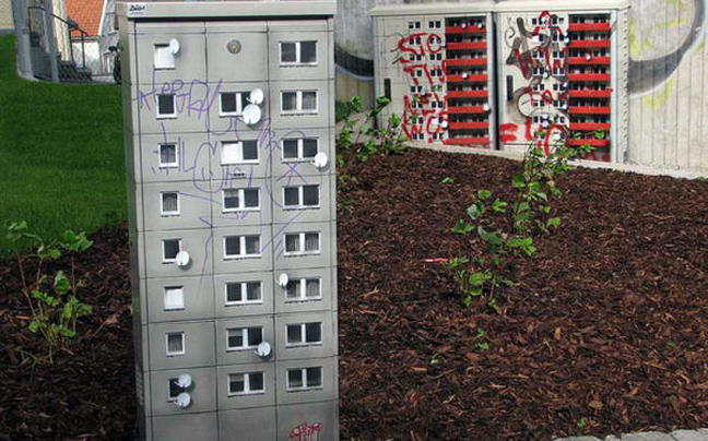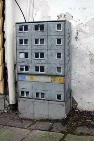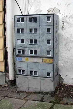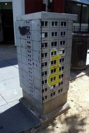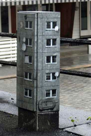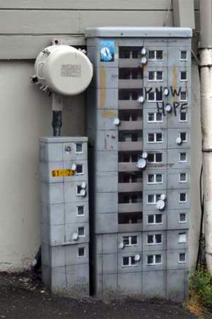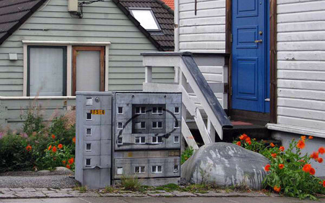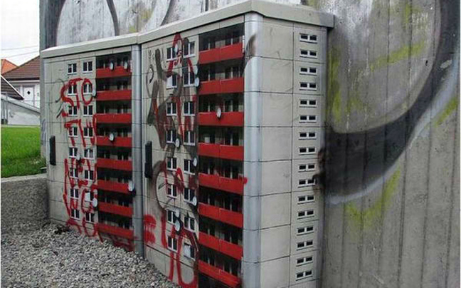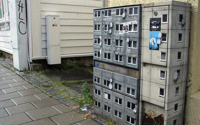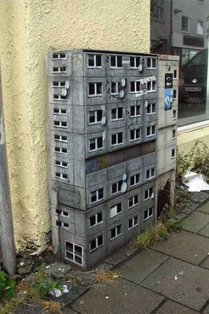 Πριν εκφράσετε την έκπληξη σας για την… κολοσσιαία του graffitti artist, δείτε την συνολική εικόνα. Και όμως είναι κουτιά της ΔΕΗ, ζωγραφισμένα έτσι ώστε να θυμίζουν μικρές πολυκατοικίες για λιλιπούτειους ανθρώπους.