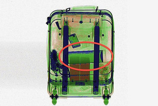 Οι εικόνες από τις βαλίτσες όπως φαίνονται μέσα από τις ακτίνες Χ δείχνουν διάφορα απαγορευμένα αντικείμενα όπως ένα όπλο, ένα μαχαίρι και μια συσκευή σπρέι.