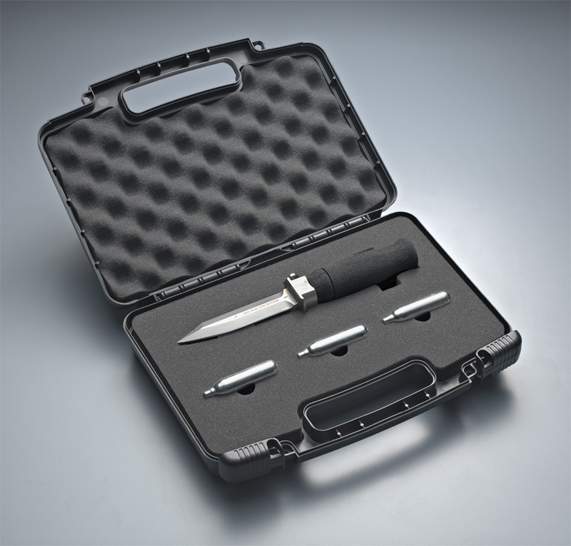 Αν και δείχνει για ένα συνηθισμένο μαχαίρι, το συγκεκριμένο σετ είναι εξοπλισμένο και με μία ειδική σύριγγα η οποία βρίσκεται κρυμμένη στη λαβή του μαχαιριού και απελευθερώνει συμπυκνωμένο αέριο με πίεση που φτάνει τα 800 psi στο σώμα του θύματος. Το αέριο παγώνει τα εσωτερικά όργανα ενώ ταυτόχρονα «φουσκώνει» το κήτος ωθώντας το στην επιφάνεια. Κοστίζει 500 δολάρια.