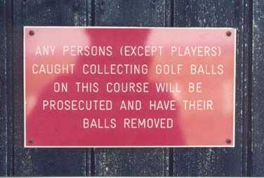 Φαίνεται πως τα κρούσματα κλοπής στο συγκεκριμένο γήπεδο γκολφ είναι πολλά. Γι’ αυτό και οι υπεύθυνοι αποφάσισαν να βάλουν μία προειδοποιητική ταμπέλα η οποία λέει: «Οποιοσδήποτε (εκτός από τους παίχτες) πιαστεί να μαζεύει μπαλάκια του γκολφ σε αυτό το γήπεδο θα διωχθεί ποινικά και θα του αφαιρέσουμε τα δικά του μπαλάκια»!