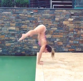 Η εικονιζόμενη γυναίκα ωστόσο έχει μετατρέψει την έξοδο από την πισίνα σε… υπερθέαμα και επίδειξη των εκπληκτικών γυμναστικών ικανοτήτων της.