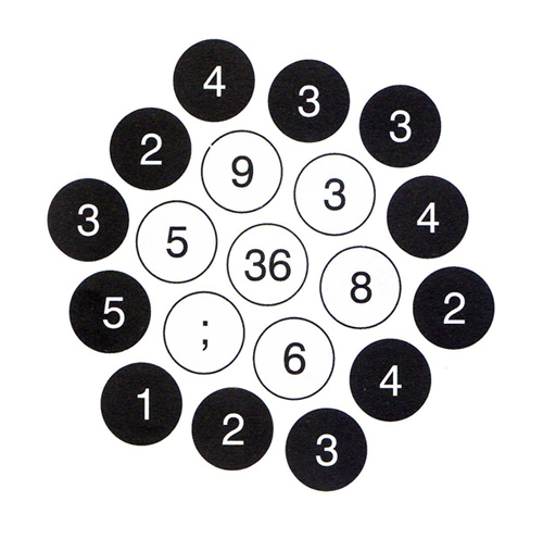 Λείπει ο αριθμός 5. Ο εξωτερικός κύκλος μας δίνει άθροισμα 36, ομοίως και ο εσωτερικός κύκλος αριθμών.