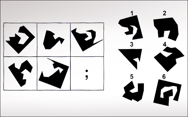 Ποιο από τα έξι σχήματα κρύβεται πίσω από το ερωτηματικό; Λύση: Το 1. Αν συνδυαστούν τα σχήματα σε κάθε στήλη, τότε σχηματίζεται ένα τετράγωνο.