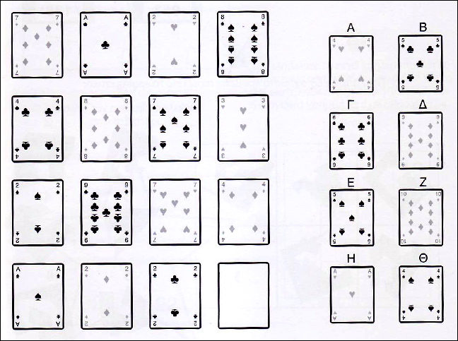 Το Η. Το άθροισμα των κόκκινων τραπουλόχαρτων σε κάθε γραμμή και στήλη ισούται με αυτό των μαύρων τραπουλόχαρτων.