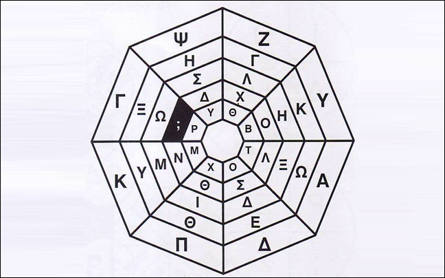 Ξεκινάμε από τον εξωτερικό δακτύλιο και κινούμαστε δεξιόστροφα. κάθε φορά κάνουμε και ένα βήμα προς το κέντρο, ενώ ταυτόχρονα προχωράμε και 4 γράμματα στην αλφάβητο μέχρι να φτάσουμε στον εσωτερικό δακτύλιο.