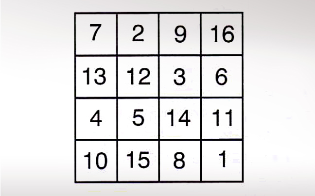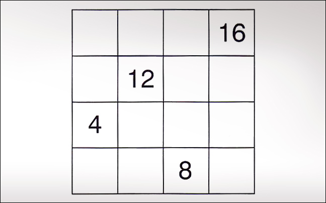 Συμπληρώστε τα κενά χρησιμοποιώντας όλους τους αριθμούς από το 1 έως και το 16, ώστε κάθε στήλη και κάθε οριζόντια ή διαγώνια γραμμή να έχει άθροισμα 34.