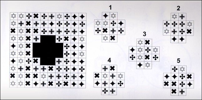 Μία ακολουθία από πέντε σύμβολα εμφανίζεται στον πίνακα. Κινείται διαγώνια από τα αριστερά προς τα δεξιά, παραλείποντας σε κάθε βήμα μία διαγώνια σειρά και ξεκινά από την αριστερή πάνω γωνία. Οι διαγώνιες σειρές, που έχουν παραλειφθεί, συμπληρώνονται από τα ίδια πέντε σύμβολα και αυτό γίνεται από τα αριστερά προς τα δεξιά και από πάνω προς τα κάτω.