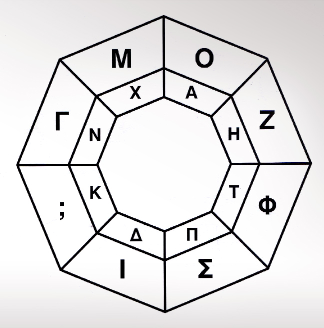Ο εξωτερικός δακτύλιος αποτελείται από τα γράμματα της αλφαβήτου που βρίσκονται σε θέσεις που είναι πολλαπλάσια του 3. Ο εσωτερικός δακτύλιος αποτελείται από τα γράμματα που βρίσκονται μία θέση μετά από αυτά του εξωτερικού δακτυλίου, τοποθετημένα με τυχαία σειρά.