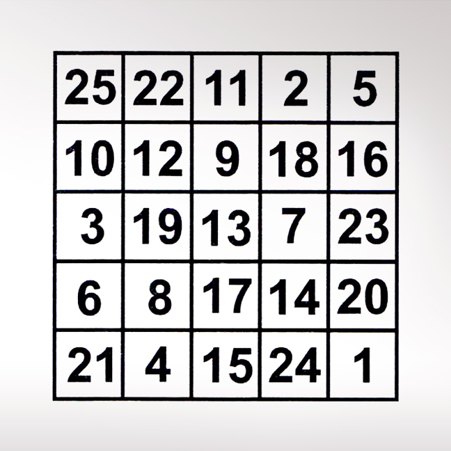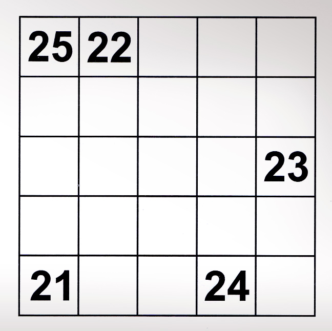 Συμπληρώστε τον παραπάνω πίνακα με αριθμούς από το 1 έως το 20, ώστε το άθροισμα κάθε στήλης και κάθε οριζόντιας ή διαγώνιας γραμμής να ισούται με 65. Λύση: