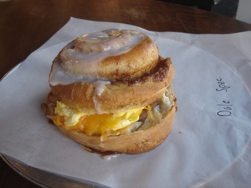 Ιδανικό πρωινό με αυγά, τυρί λουκάνικο μέσα σε ρολό κανέλας ένας συνδυασμός 1.113 θερμίδες.