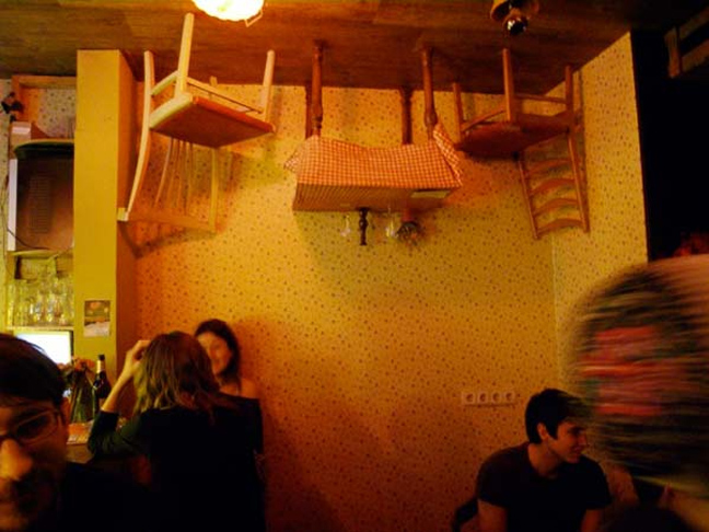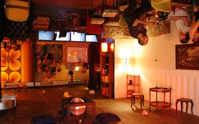 Καρέκλες, τραπέζια, διακοσμητικά αντικείμενα, φωτιστικά και ό,τι μπορεί να φανταστεί κανείς κρέμονται ανάποδα από την οροφή του μπαρ, δημιουργώντας την αίσθηση στους επισκέπτες ότι ο κόσμος αναποδογυρίστηκε!