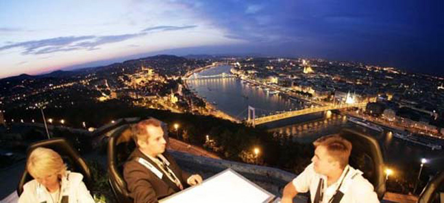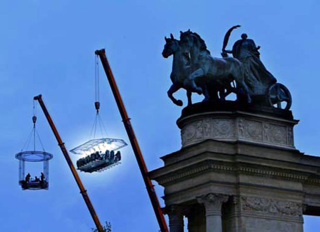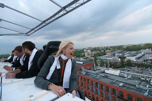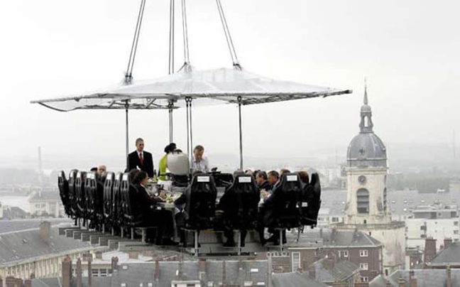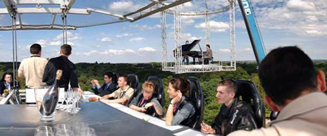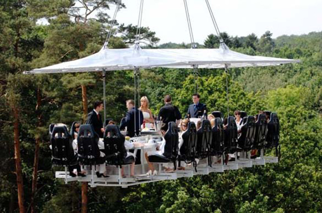 Το εναέριο εστιατόριο βρίσκεται 50 μέτρα πάνω από το έδαφος με τη βοήθεια ενός γερανού και μπορεί να φιλοξενήσει 22 άτομα, έναν σεφ και σερβιτόρους.
