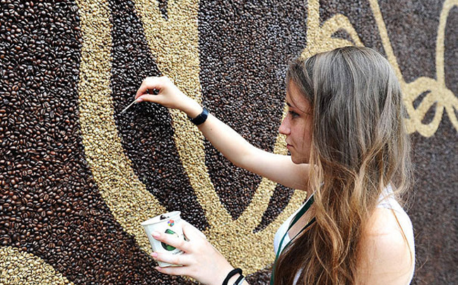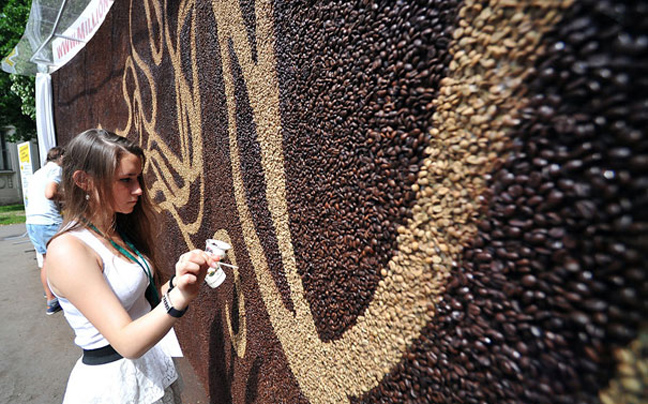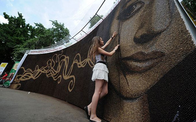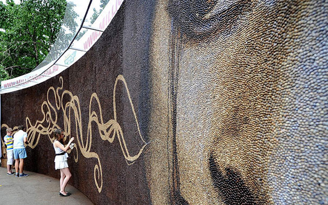 Η νεαρή Ρωσίδα καλλιτέχνις Arkady Kim κάλυψε 30 τετραγωνικά μέτρα τοίχου στο Πάρκο Πολιτισμού και Αναψυχής Γκόρκι της Μόσχας με ένα πορτραίτο αποκλειστικά κατασκευασμένο από κόκκους καφέ.