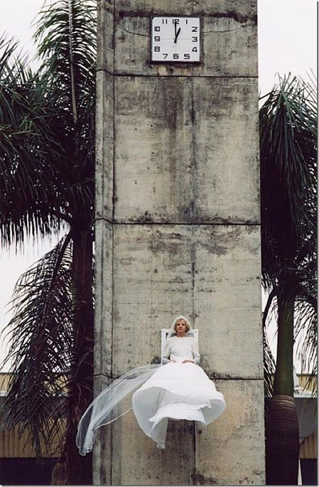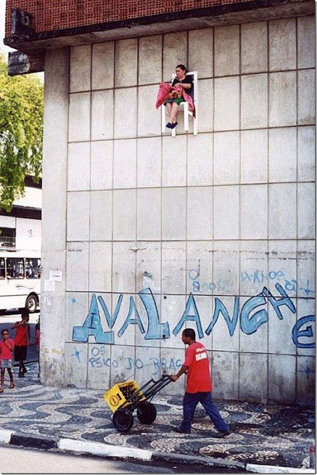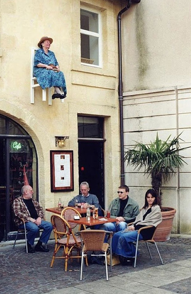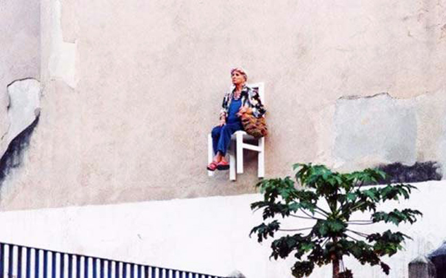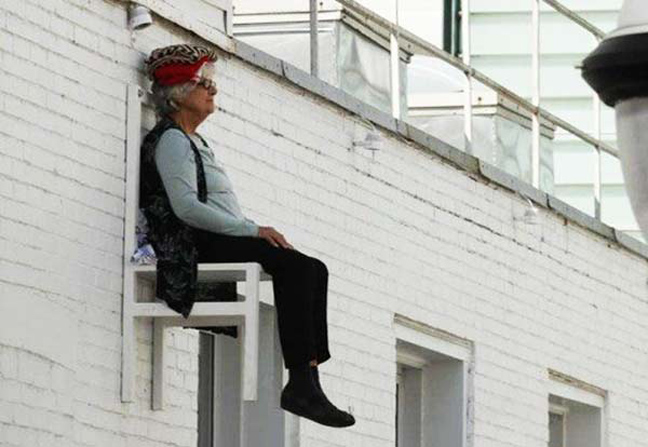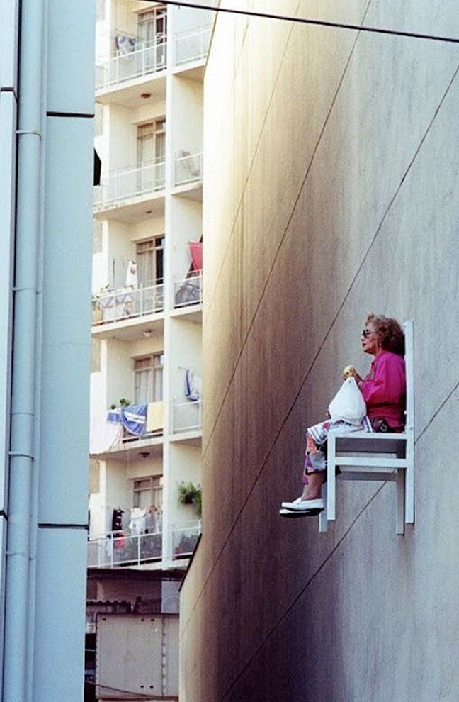 Είκοσι μέτρα πάνω από τα πεζοδρόμια, σε τυχαίους δρόμους του Μόντρεαλ, η καλλιτέχνις Angie Hiesl στερέωσε λευκές καρέκλες πάνω στις οποίες κάθισαν γιαγιάδες.