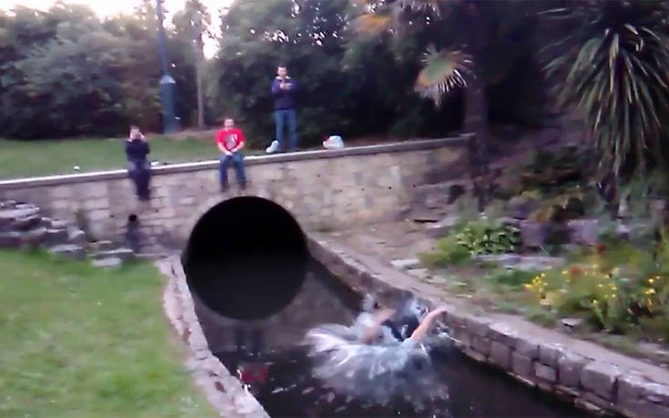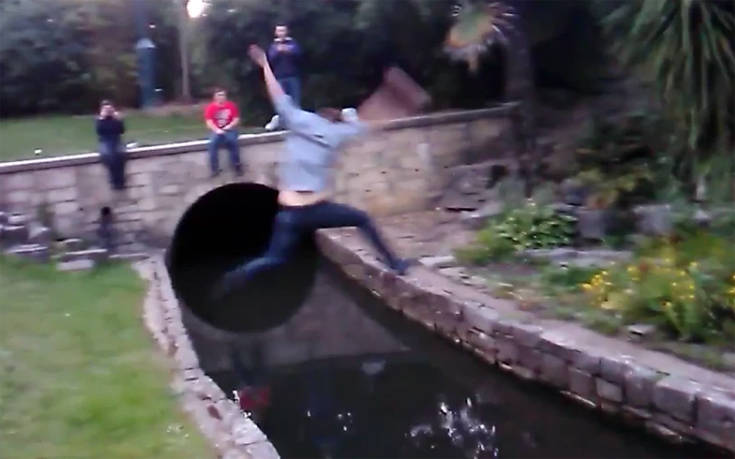 Παρόντες είναι οι φίλοι του που αντί να τον αποτρέψουν, τον παροτρύνουν να τον κάνει για να καταγράψουν την προσπάθειά του με το κινητό τους.
