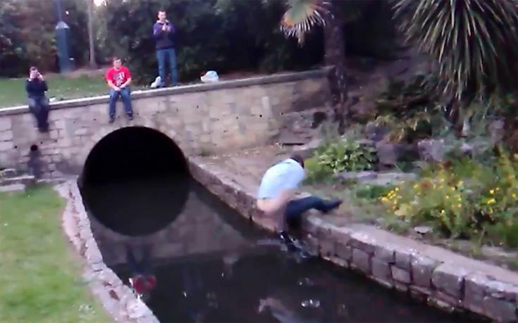 Όταν τελικά το παίρνει απόφαση τα πράγματα δεν πάνε όπως θα περίμενε. Προσγειώνεται άτσαλα στο νερό αφού πρώτα χτυπά τα απόκρυφά του σημεία στο πέτρινο τοιχίο της απέναντι όχθης. Οι φίλοι του γελούν περιπαικτικά.