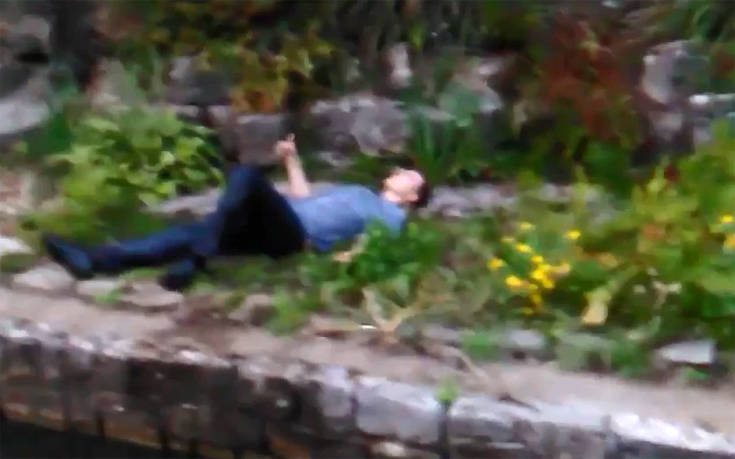 Βγαίνει από το νερό και ξαπλώνει στο χορτάρι κάνοντας νόημα με το χέρι του ότι είναι καλά. Στο τέλος συνειδητοποιεί ότι έχασε τα γυαλιά του που έπεσαν στο νερό.