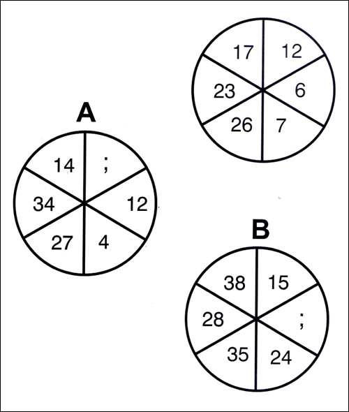 Στον κύκλο Α έχουμε τον αριθμό 14 και στον κύκλο Β τον αριθμό 16. Πολλαπλασιάζουμε τα ψηφία κάθε αριθμού που βρίσκεται στο αριστερό ημικύκλιο και τοποθετούμε το γινόμενό τους στον απέναντι κυκλικό τομέα.