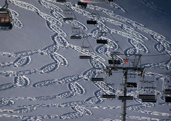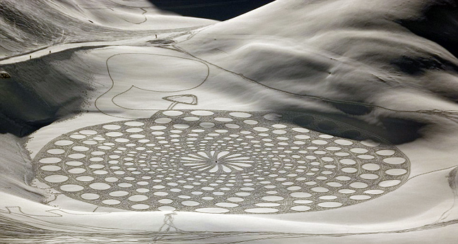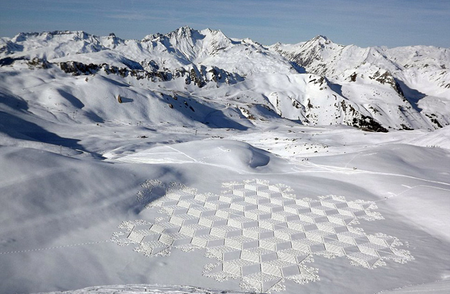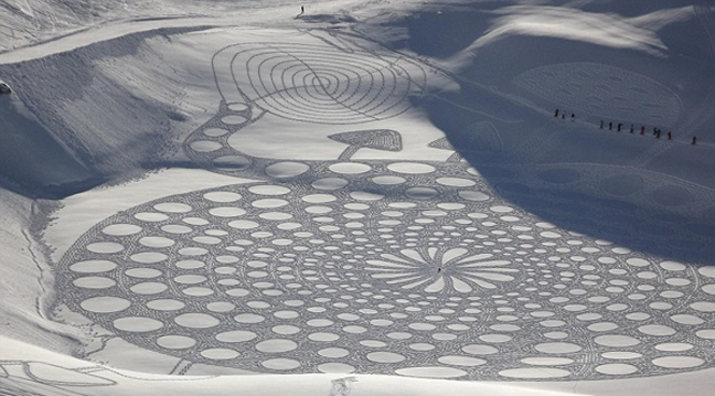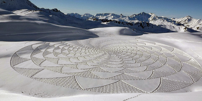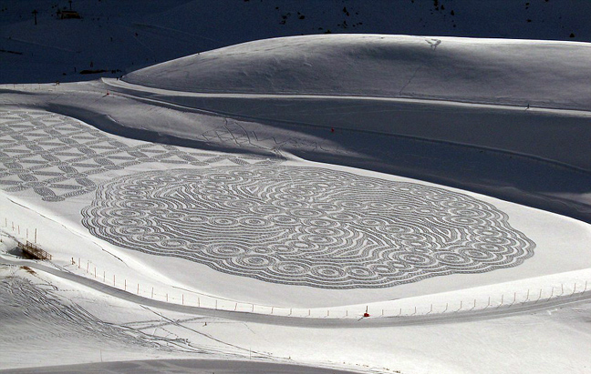 Οι δημιουργίες ανήκουν στο Βρετανό Simon Βeck ο οποίος με ειδικές μπότες έφτιαξε εντυπωσιακά σχέδια στις χιονισμένες πλαγιές των Γαλλικών Άλπεων. Για το κάθε έργο χρειάστηκαν τουλάχιστον δέκα ώρες περπατήματος.