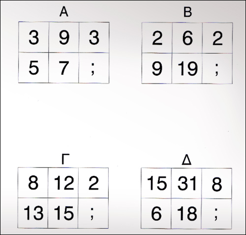 Στο κουτί Α είναι ο αριθμός 1, στο Β ο 5, στο Γ ο 1 και στο Δ ο 6. Οι αριθμοί της τρίτης στήλης είναι το πηλίκο της διαφοράς των δύο πρώτων αριθμών, της ίδιας γραμμής, διαιρούμενη με το 2.